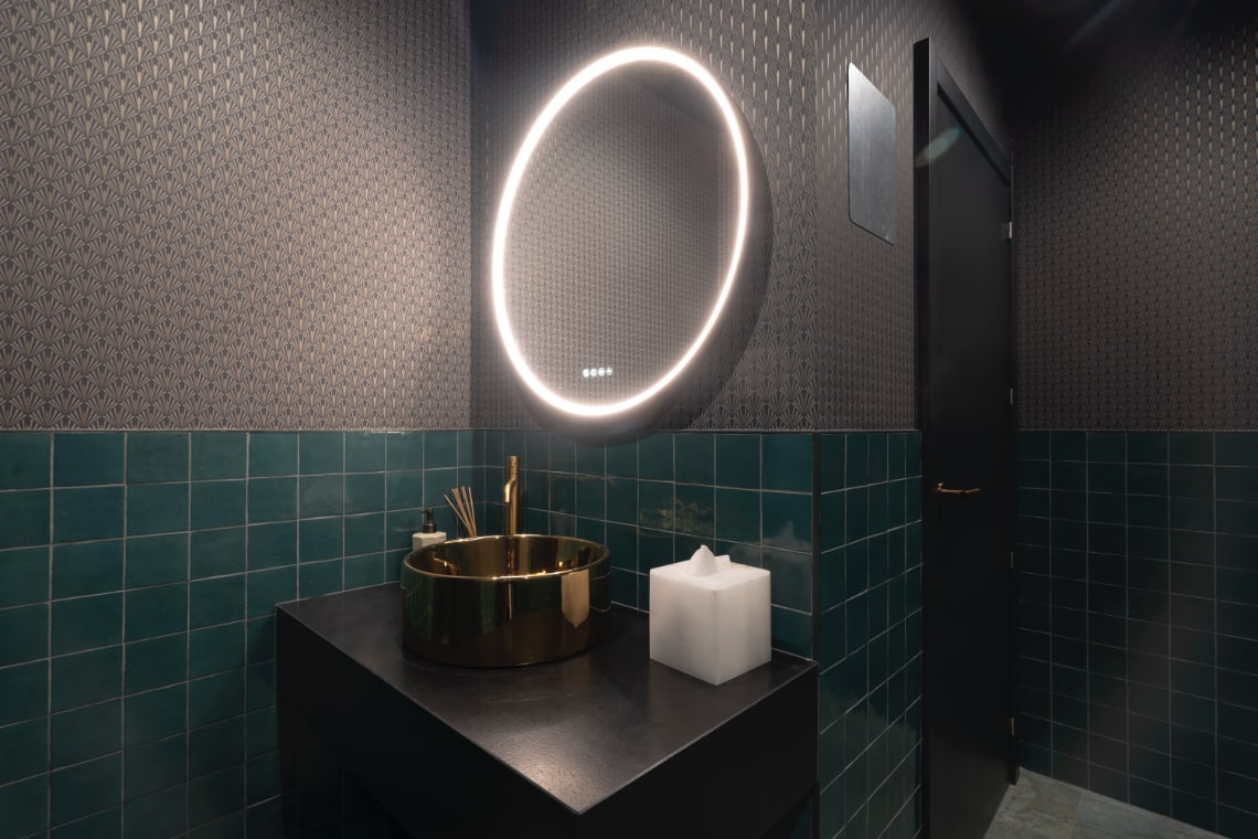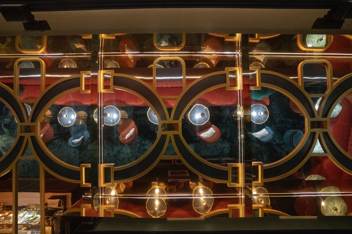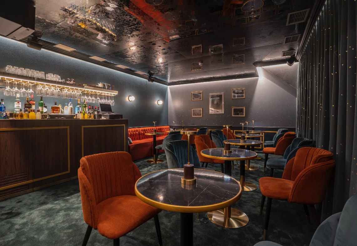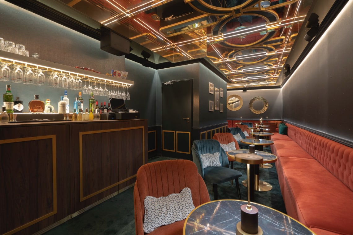 En este diálogo, el techo de celosías se erige como el elemento central: una estructura suspendida que tamiza la iluminación y transforma el ambiente. En el bar y en uno de los Vip Lounges, estas celosías actúan como un velo lumínico que filtra el aire y el tiempo, recordando las artes decorativas del teatro original reinterpretadas desde la ligereza y la abstracción contemporánea.