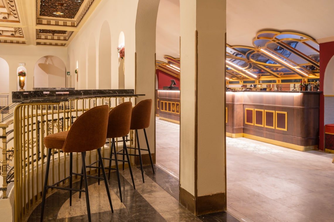 El diseño recorre distintos ámbitos varios salones vip hasta las áreas de bar y tránsito, tejiendo una narrativa visual que reinterpreta la ornamentación original a través de la luz, la textura y la geometría.