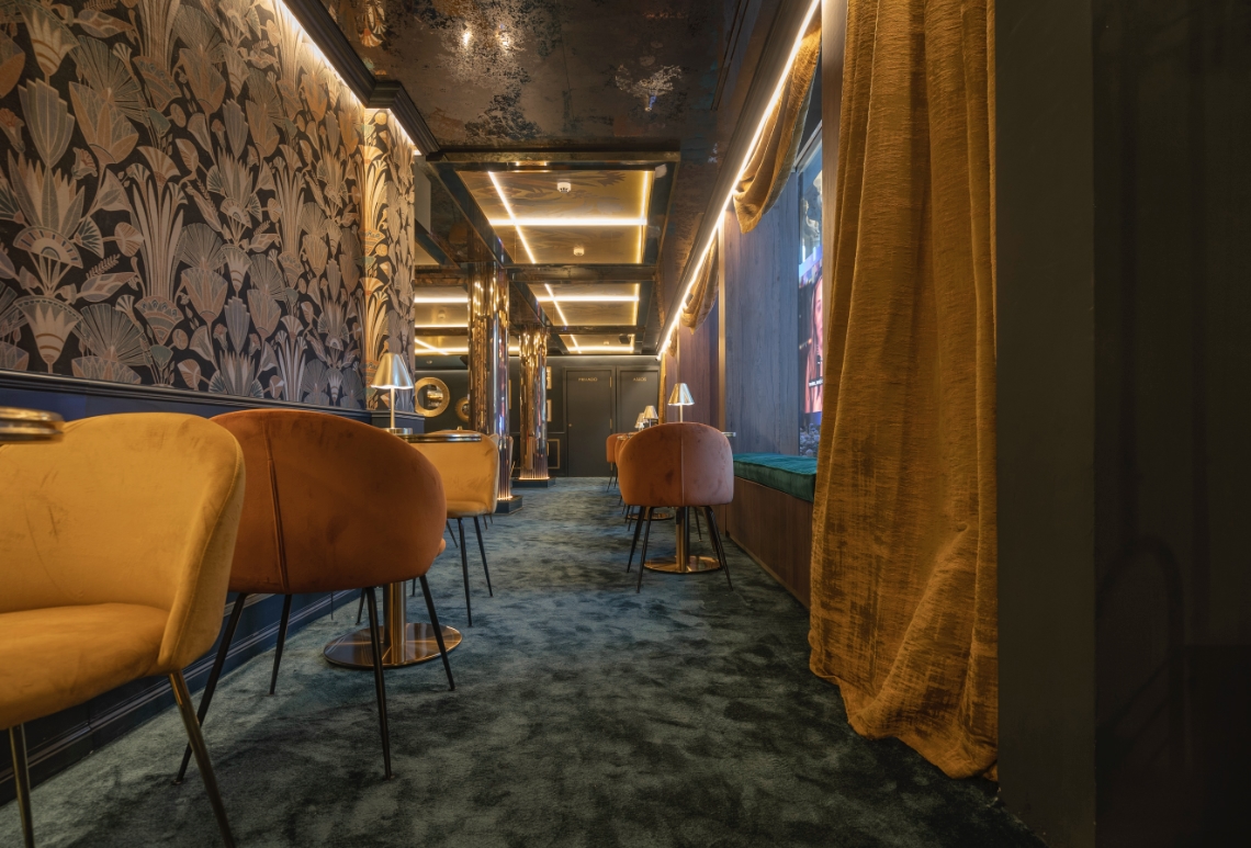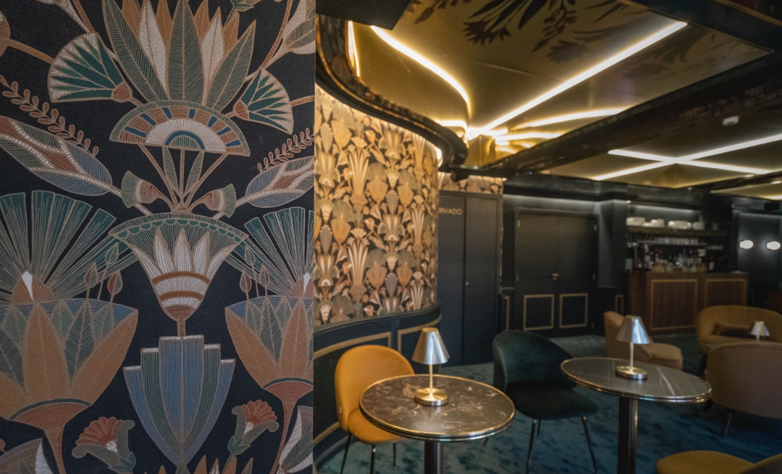 La personalidad de las artes decorativas españolas de los años 20 ha sido otro de los pilares conceptuales: colores cálidos, brillos dorados, motivos geométricos y materiales que evocan los cafés y salones de aquella época dorada.