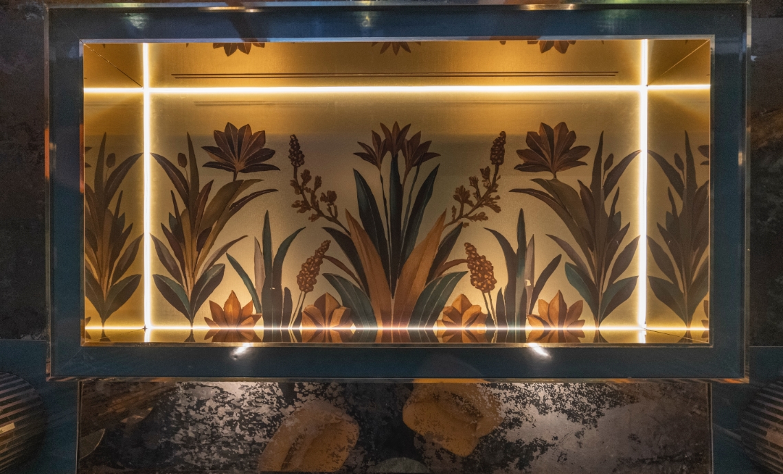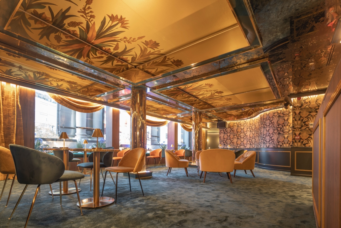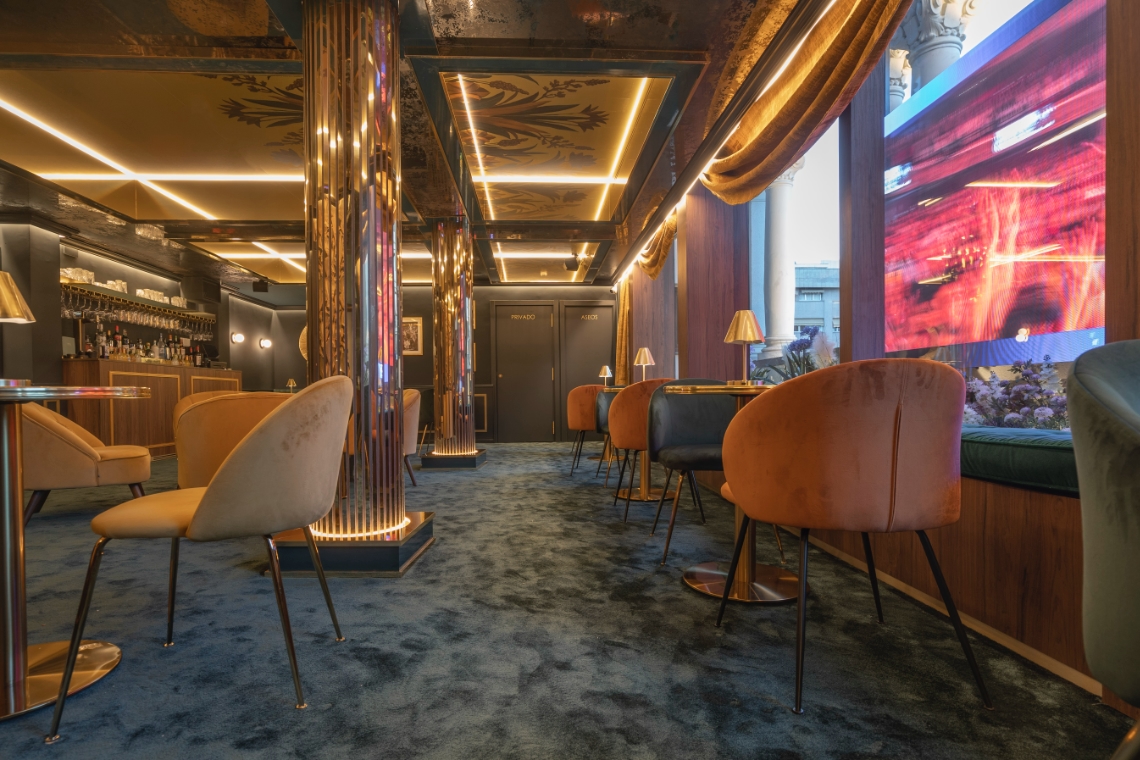 Pero si algo define este proyecto es el trabajo artesanal que lo sustenta. Lola Rúa ha trabajado cada detalle con una sensibilidad casi escenográfica, colaborando mano a mano con artesanos españoles para dar vida a elementos únicos: las columnas que presiden los espacios, las lámparas flor, ya convertidas en un sello inconfundible de su estilo, o los techos ornamentados, previamente dibujados a mano en el estudio antes de cobrar vida en el teatro. “Crear estos espacios ha sido una fantasía —explica Rúa—, bares y lounges con aire teatral, pero con acabados sofisticados y de una calidad exquisita”. El resultado final es una mezcla de artesanía y contemporaneidad, de drama y elegancia, que convierte cada estancia en una escena, cada lámpara en un foco y cada textura en una historia.